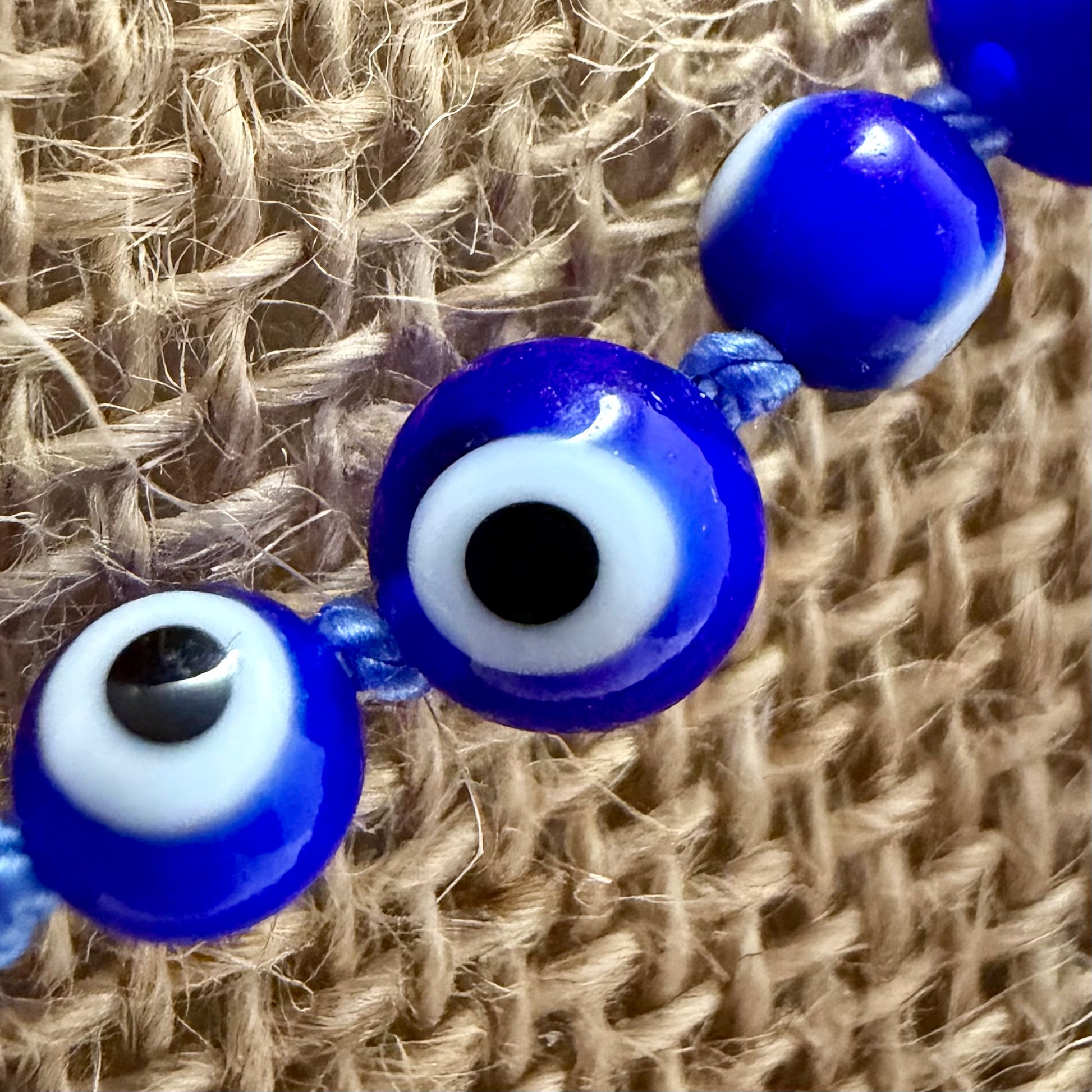 El Amuleto is a modern talisman of protection and light. Hand-knotted with 108 traditional glass evil eye beads, this mala embodies the ancient belief that awareness deflects negativity and restores balance. Each bead carries the protective symbol of the eye, watching over its wearer and reflecting light wherever it falls.