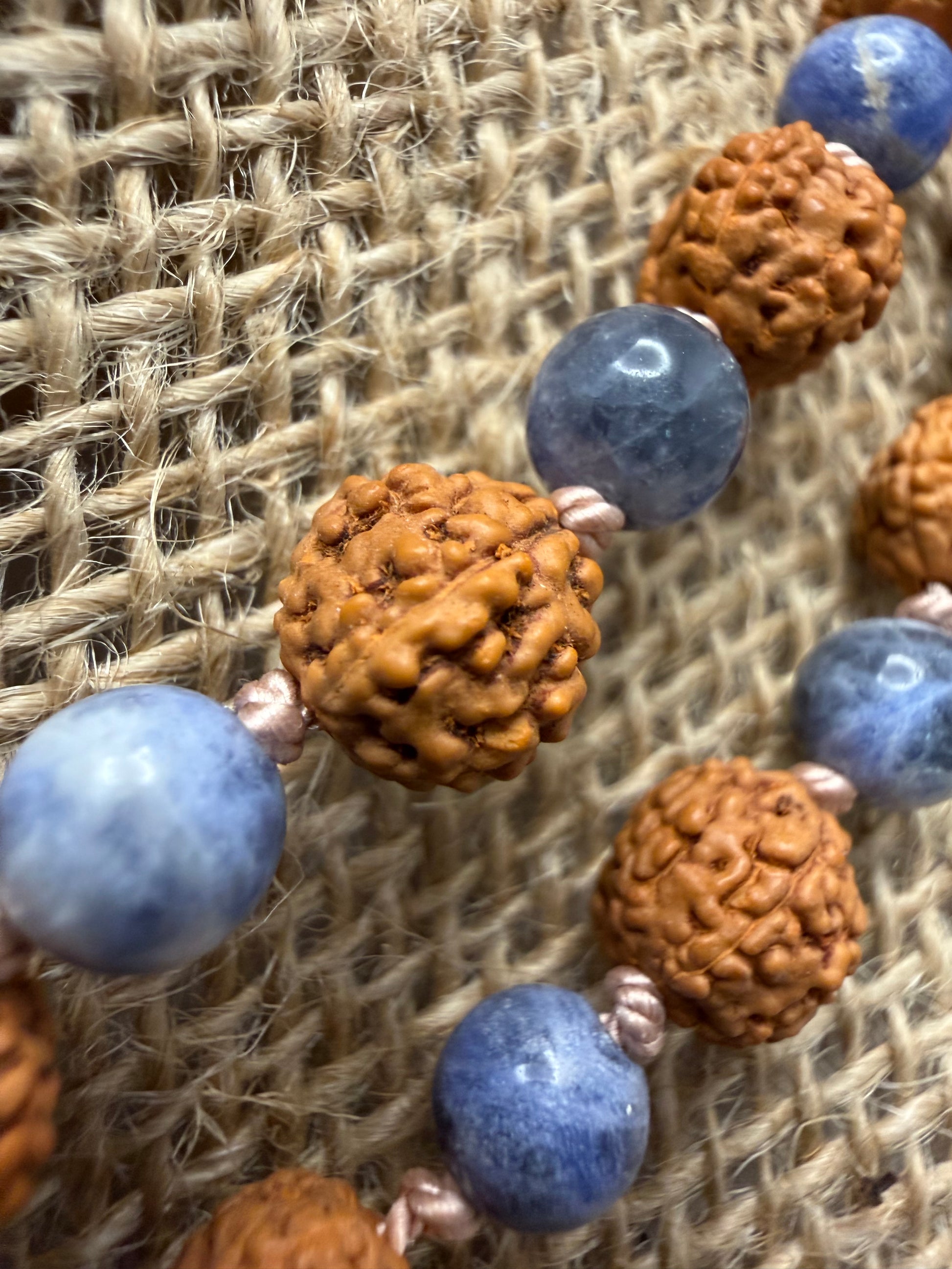 Hand-knotted with devotion and light, The Dharma Sky Mala carries the energy of both Earth and ether. It pairs sacred Rudraksha seeds, revered for their grounding and spiritual protection, with the tranquil blue tones of sodalite, a stone of clarity, truth, and harmony.