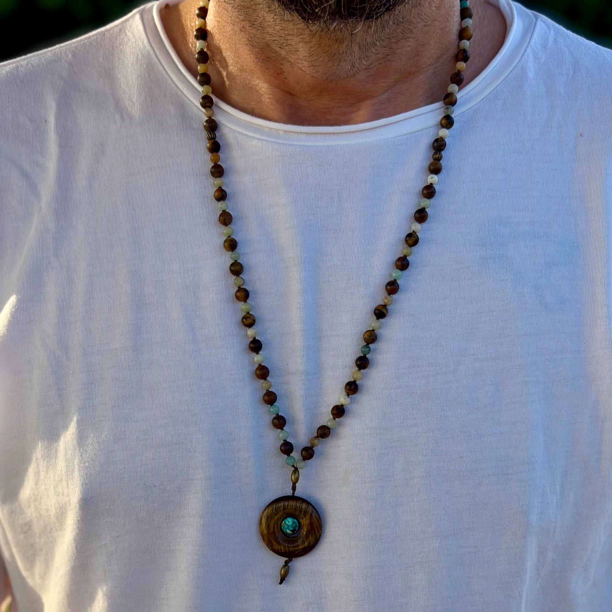 Tiger Eye · Amazonite · Turquoise Inlay · Bronze Accents · Hand-Knotted Cord