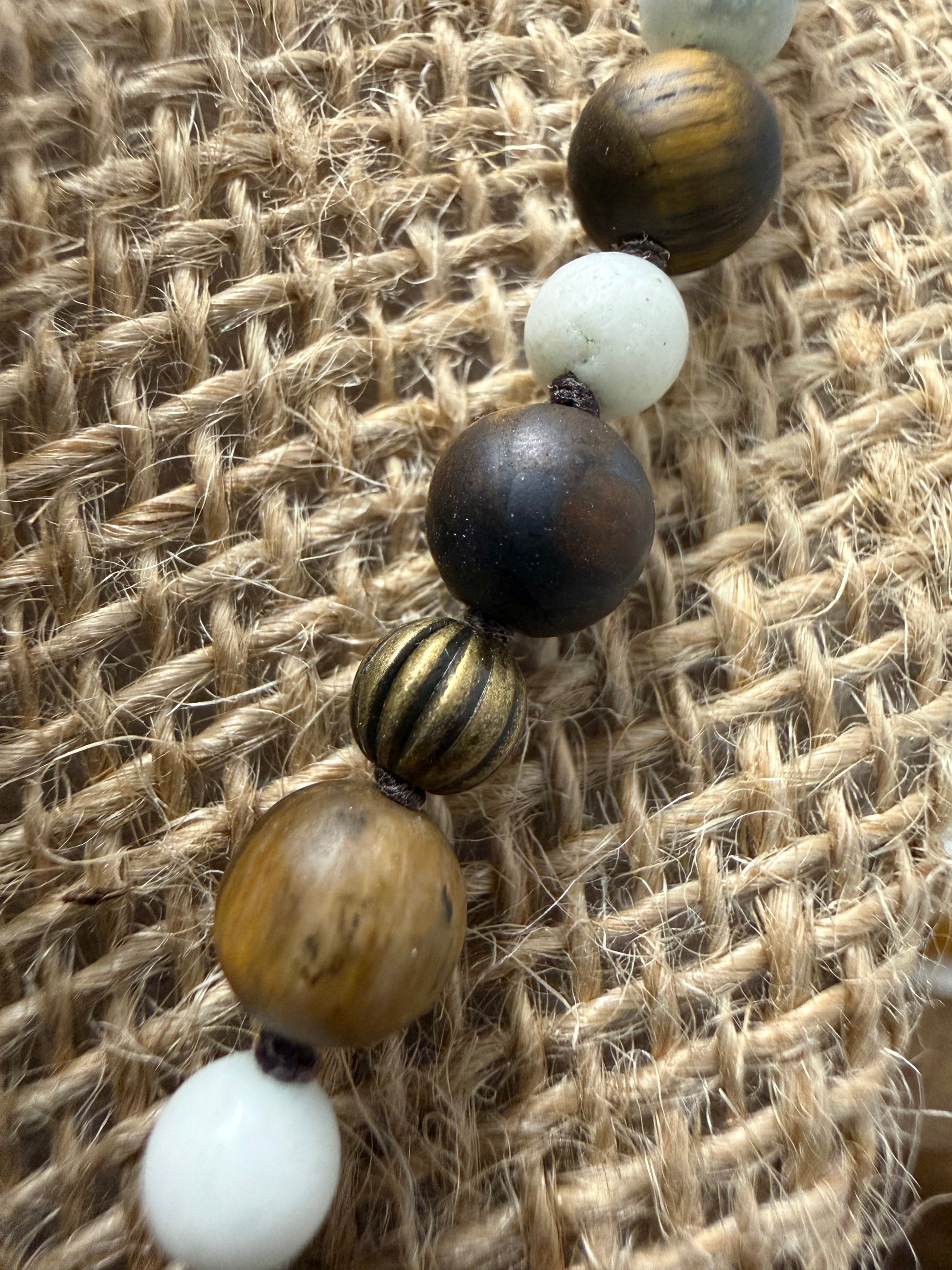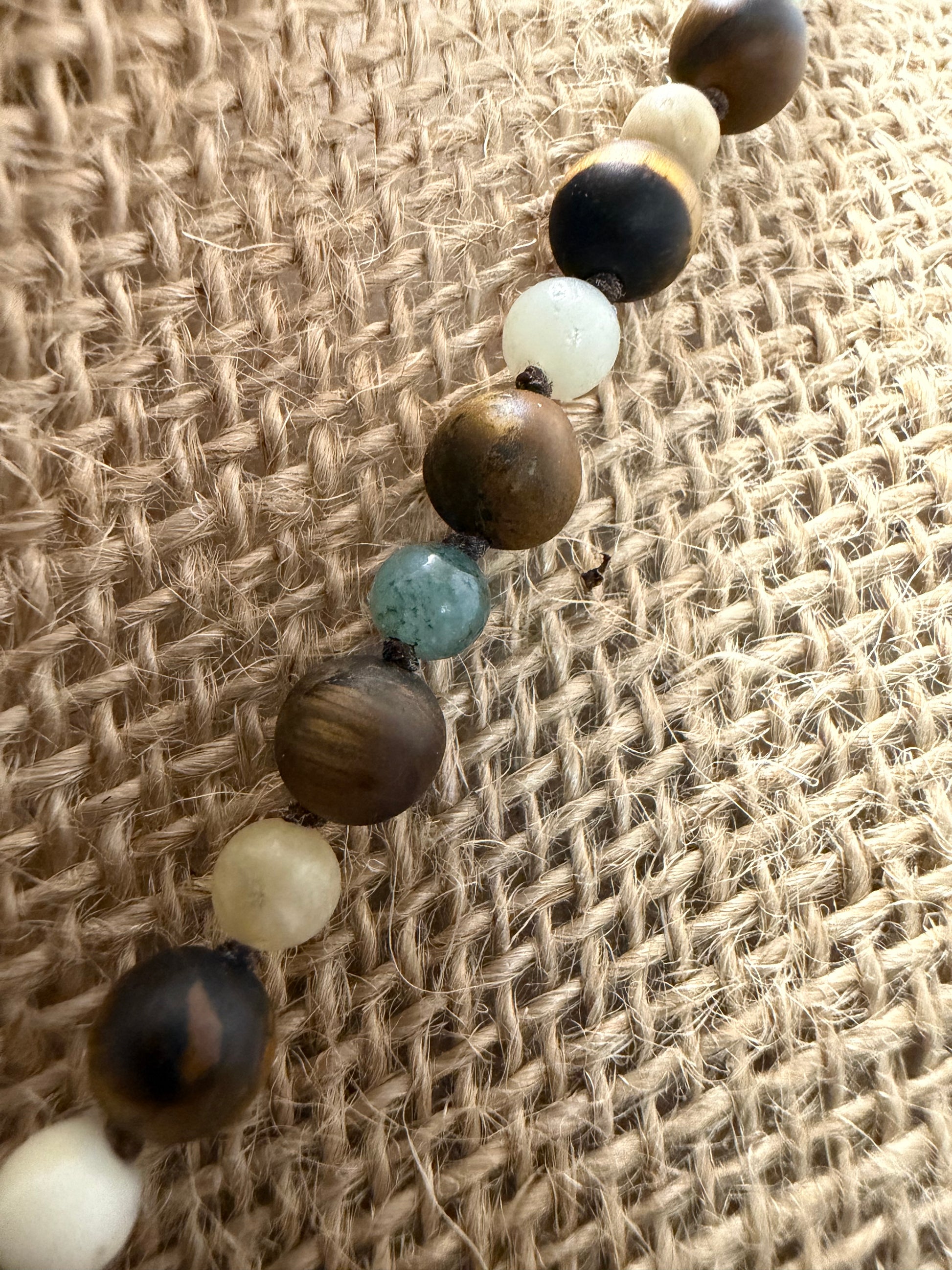Hand-knotted on soft cord, it pairs the natural warmth of Tiger Eye with the soothing energy of amazonite, balanced by subtle bronze accents. Each bead carries the resonance of time and transformation, speaking softly of rooted peace and living flow.
