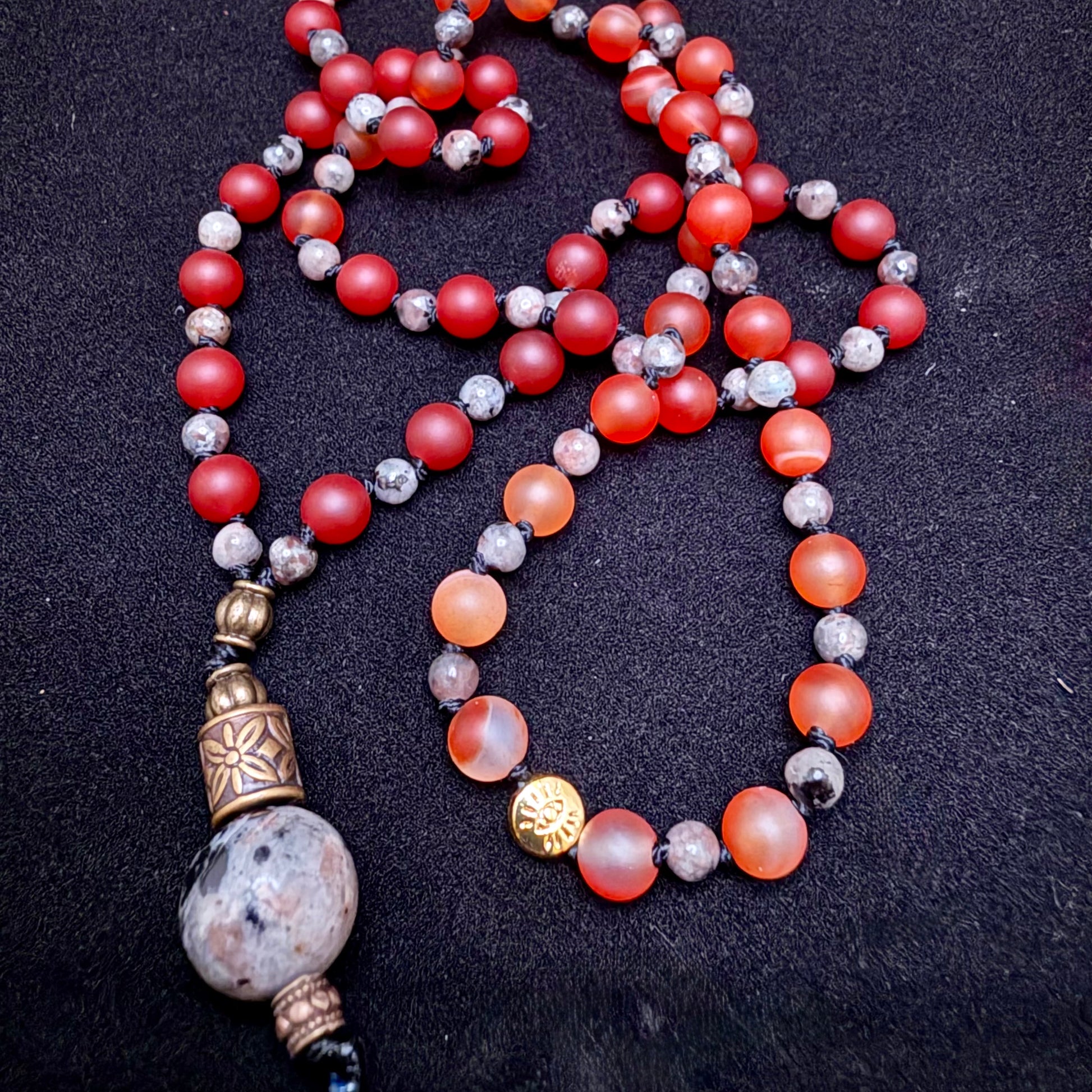 Hand-knotted in meditation, it weaves together Yooperlite and Carnelian, two stones that speak the language of transformation. Yooperlite, a stone of illumination and hidden truth, reveals its celestial glow under UV light — a reminder that our light is always present, waiting to be seen. Carnelian, the stone of vitality and courage, ignites creativity and strengthens the will to act. Together, they create a harmony between reflection and movement, grounding and passion.